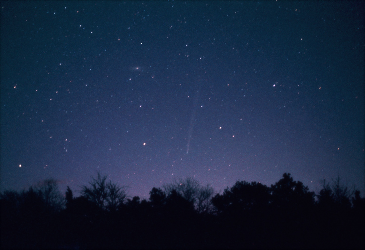 Comments: Glowing at around magnitude 4.5 and displaying a tail around 7 degrees, Comet Bradfield C/2004 F4 joins the Great Andromeda Galaxy - M31 in the pre-dawn spring sky.