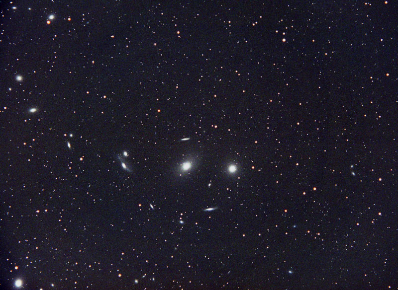 Comments: The image seen here is centered on the bright elliptical galaxies M86 and M84, respectively. The line of galaxies extending off to the upper left(NE in image) is commonly know as Markarian's Chain. The brighter galaxies included in the chain include NGC 4438, 35, 61, 73, 77 and 59. The spiral and lenticular galaxies NGC 4305 and 4306 can be seen on the far right of the image while M87 can be found in the extreme lower left corner.