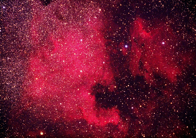 Located due west of NGC7000 is the Pelican Nebula, IC5067-70. The Pelican is also aptly named in that it clearly resembles the side profile of a pelican. The head and beak are especially clear.